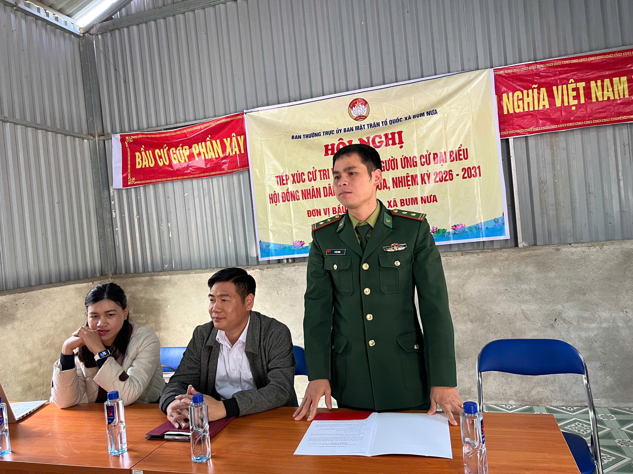 Các ứng cử viên đại biểu HĐND xã Bum Nưa khóa XXII tiếp xúc, vận động cử tri, đơn vị bầu cử số 02, gồm: CHÀ GÁ, KHOANG THÈN 1+2, SEO THÈN, THÒ MA, ĐỒN BIÊN PHÒNG