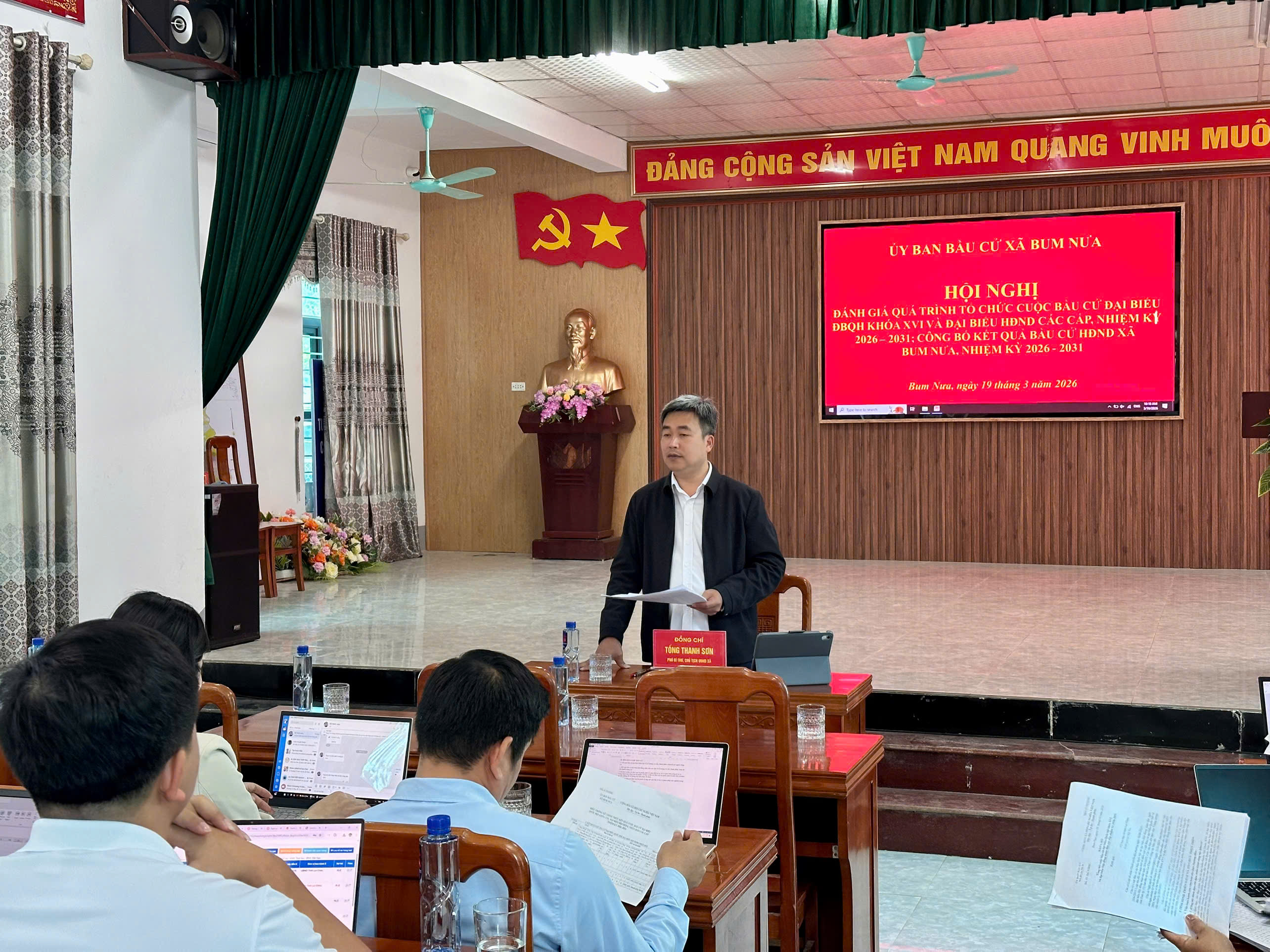 Sáng ngày 19/03/2026, Ủy ban bầu cử xã Bum Nưa đã tổ chức Hội nghị đánh giá công tác tổ chức cuộc bầu cử đại biểu Quốc hội khóa XVI và đại biểu Hội đồng nhân dân các cấp nhiệm kỳ 2026 – 2031, đồng thời công bố kết quả bầu cử đại biểu HĐND xã Bum Nưa nhiệm kỳ 2026 – 2031. Đồng chí Tống Thanh Sơn - Phó Bí thư, Chủ tịch UBND, Chủ tịch Ủy ban bầu cử xã chủ trì hội nghị.