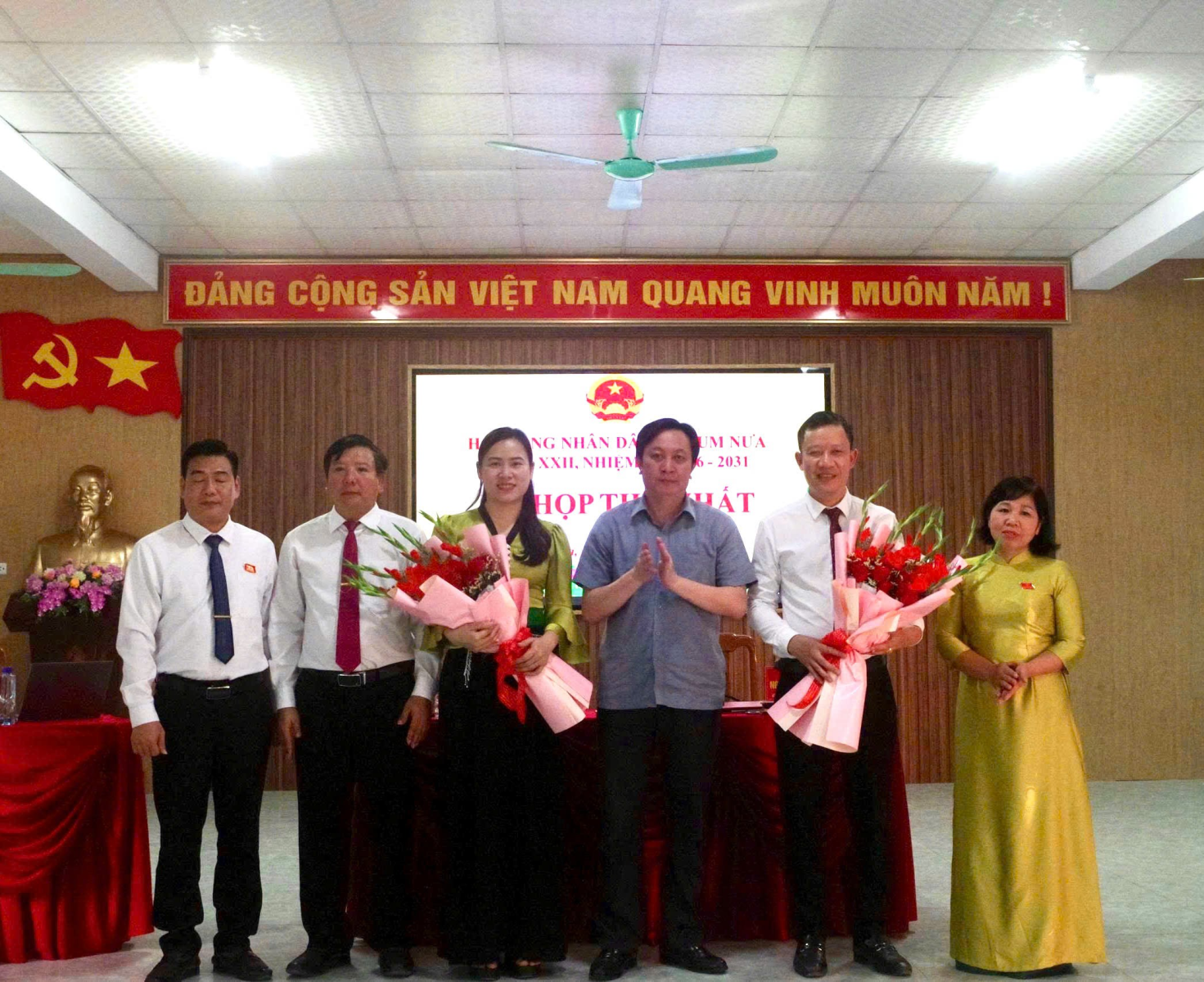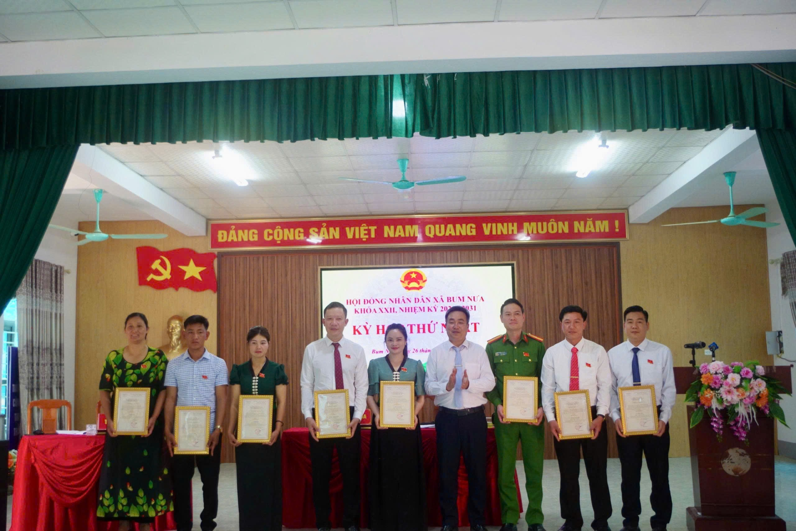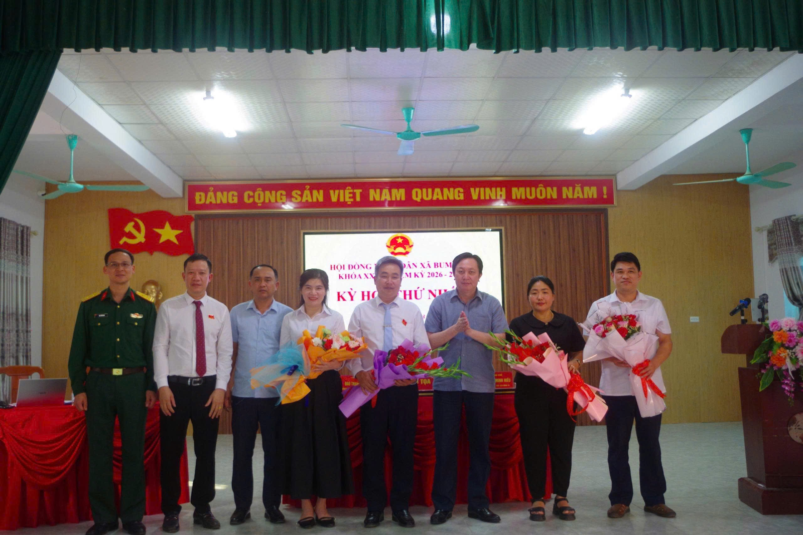 tặng hoa chúc mừng các đồng chí tái cử và trúng cử các chức danh HĐND xã Bum Nưa khóa XXII nhiệm kỳ 2026-2031