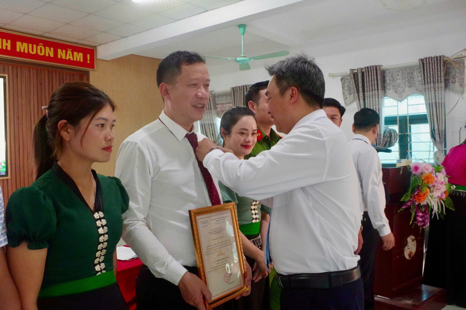 tặng hoa chúc mừng các đồng chí lãnh đạo UBND xã khóa mới và các ủy viên UBND