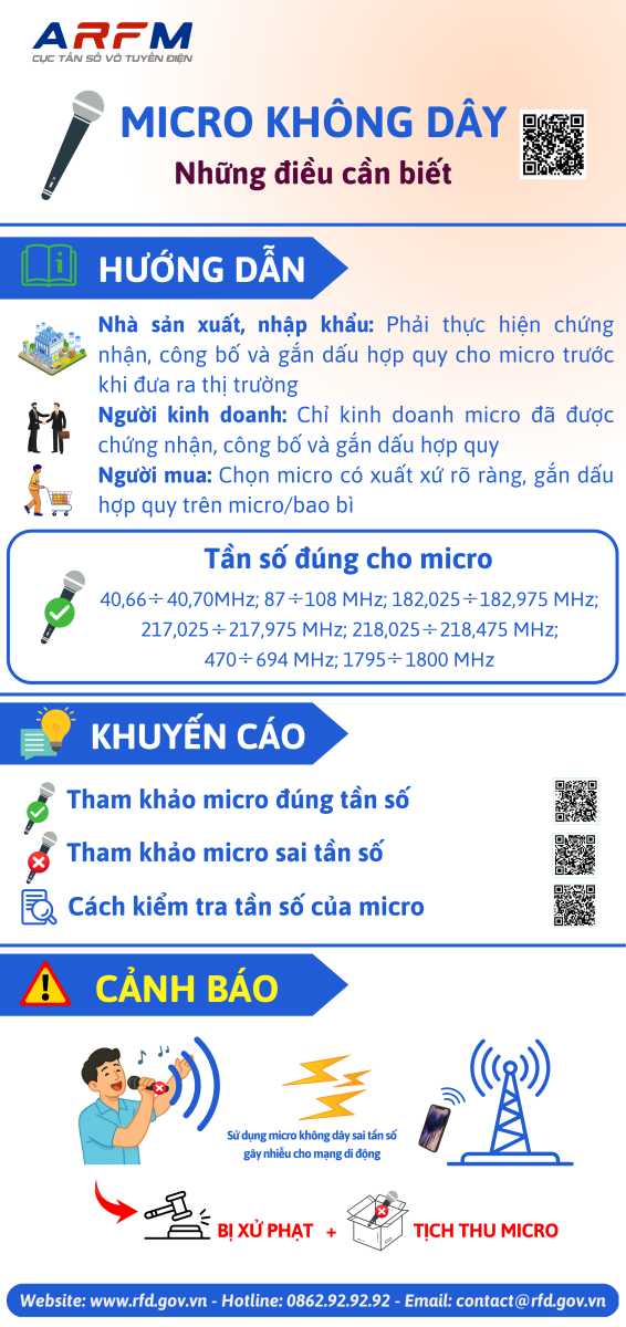 Cục Tần số vô tuyến điện đã phối hợp với các Sở Thông tin và Truyền thông (nay là Sở Khoa học và Công nghệ) bằng hệ thống thông tin cơ sở/các tổ công nghệ số cộng đồng/tổ dân phố/thôn tại địa phương tuyên truyền đến người dân không quảng cáo, kinh doanh và sử dụng thiết bị vô tuyến điện bất hợp pháp, trong đó khuyến cáo khi mua micro không dây cần kiểm tra rõ nguồn gốc xuất xứ, phải được gắn dấu hợp quy (gắn trên micro hoặc bao bì…).