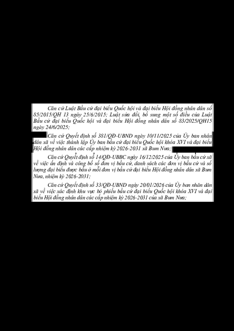 | Tiêu đề văn bản | NGHỊ QUYẾT Công bố kết quả bầu cử và danh sách những người trúng cử đại biểu Hội đồng nhân dân xã Bum Nưa khóa XXII, nhiệm kỳ 2026-2031 | ||